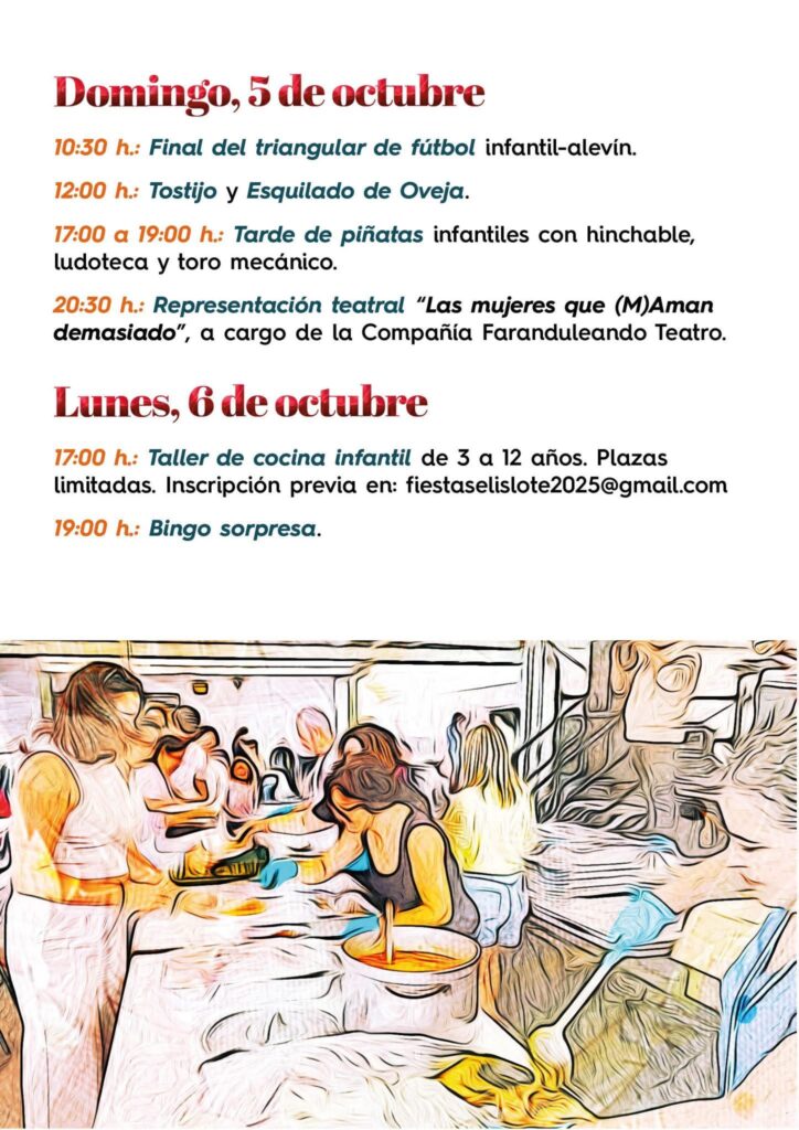 17:00 h.: Taller de cocina infantil de 3 a 12 años. Plazas limitadas. Inscripción previa en: fiestaselislote2025@gmail.com