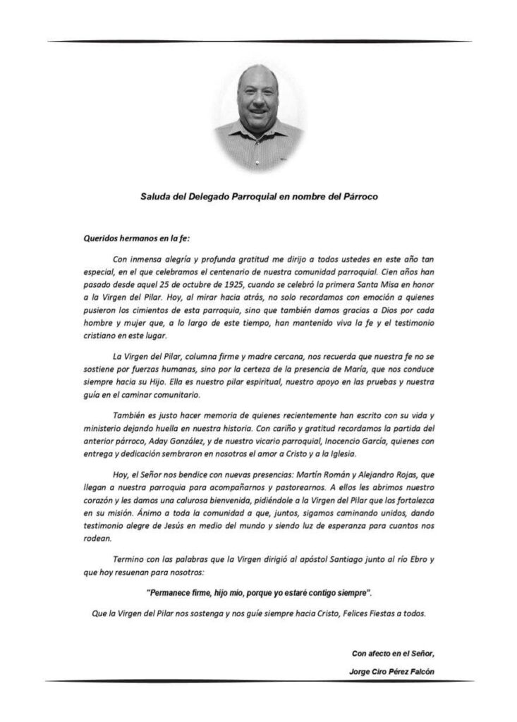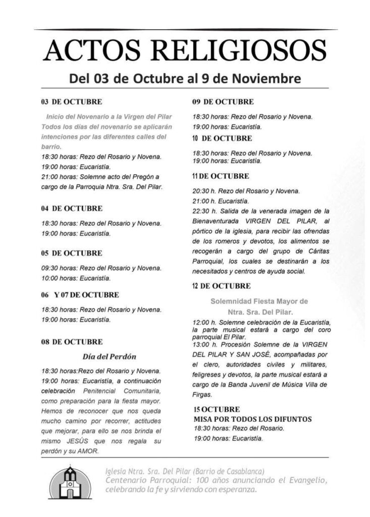 21:00 h. Iglesia Ntra. Sra. del Pilar – Solemne Acto del Pregón, a cargo de la Parroquia de Ntra. Sra. del Pilar.