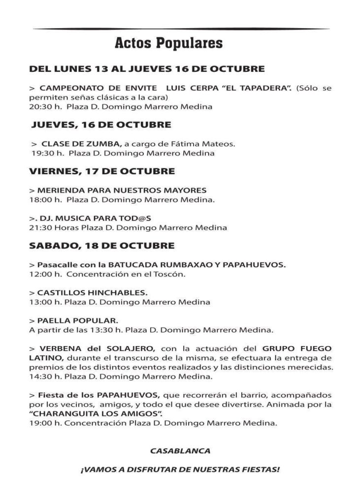 19:00 h. Plaza D. Domingo Marrero Medina – Fiesta de los Papahuevos, que recorrerán el barrio acompañados por vecinos, amigos y todo aquel que desee participar, animada por la charanga Los Amigos.