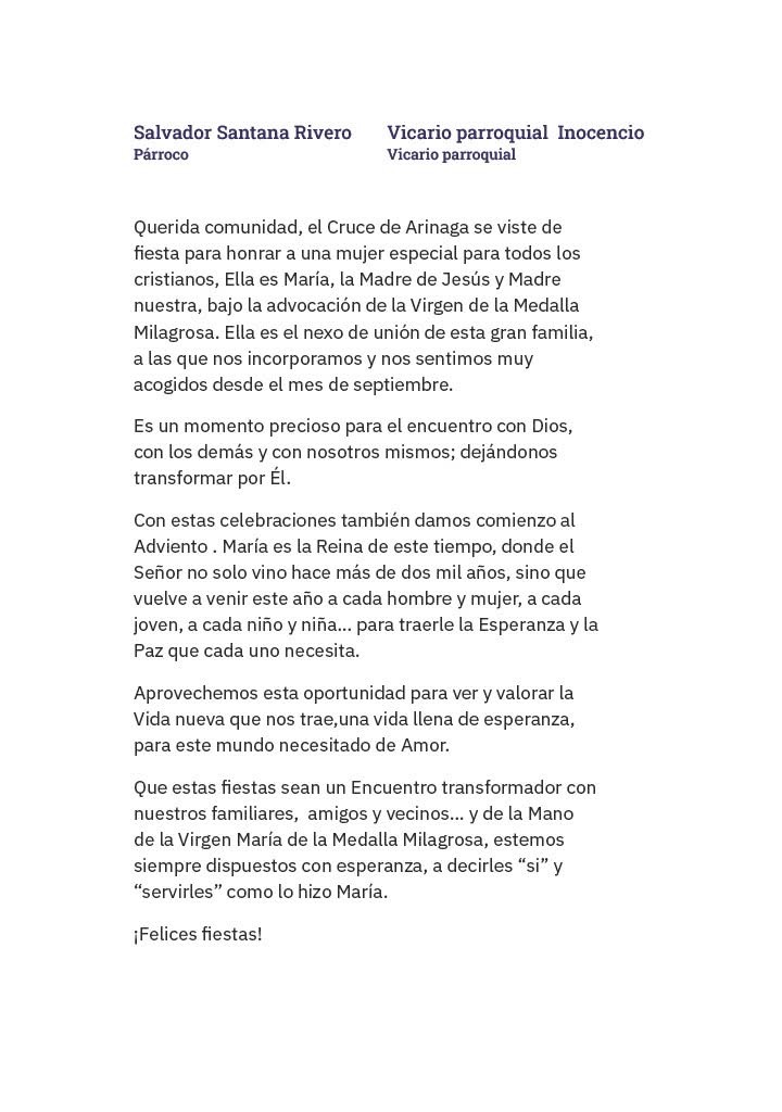 12:30 Procesión de la imagen de la virgen de la Milagrosa. Al terminar Bendición del Tradicional Belén del Cruce de Arinaga.