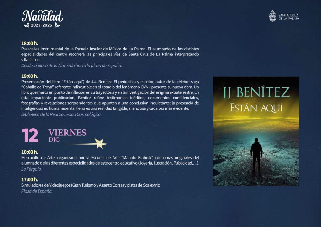 19:00 h. Presentación del libro «Están aquí, de J.J. Benítez. El periodista y escritor, autor de la célebre saga «Caballo de Troya», referente indiscutible en el estudio del fenómeno OVNI, presenta su nueva obra. Un libro que marca un punto de inflexión en su trayectoria y en la investigación del enigma extraterrestre. En esta impactante publicación, Benítez reúne testimonios inéditos, documentos confidenciales, fotografías y revelaciones sorprendentes que apuntan a una conclusión inquietante: la presencia de inteligencias no humanas en la Tierra es una realidad tangible, silenciosa y cada vez más evidente.
