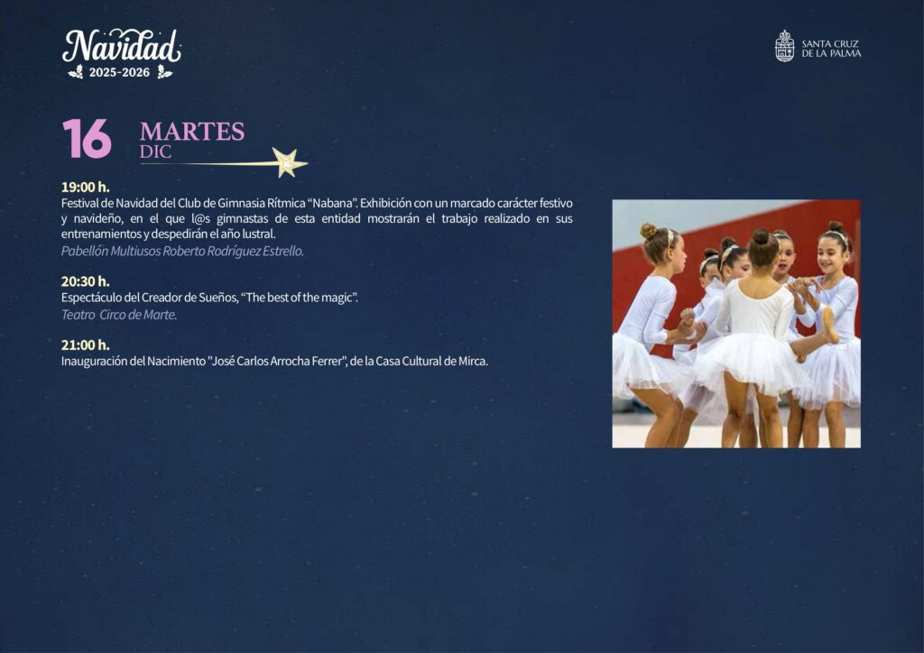 19:00 h. Festival de Navidad del Club de Gimnasia Rítmica «Nabana». Exhibición con un marcado carácter festivo y navideño, en el que l@s gimnastas de esta entidad mostrarán el trabajo realizado en sus entrenamientos y despedirán el año lustral.