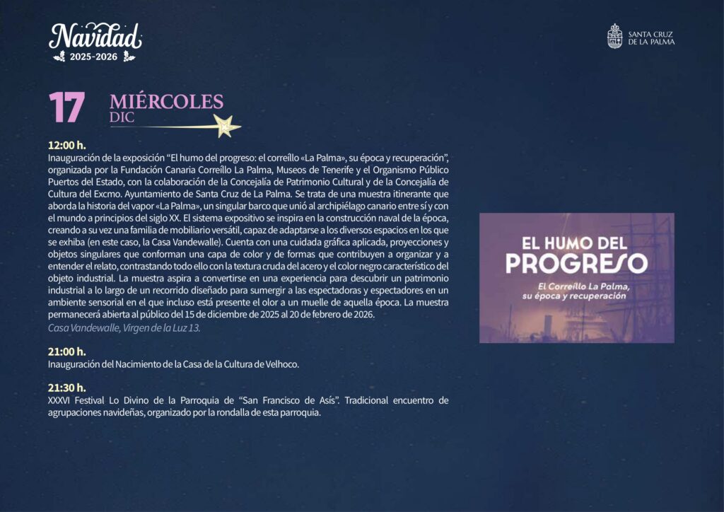 12:00 h. Inauguración de la exposición «El humo del progreso: el correíllo «La Palma», su época y recuperación», organizada por la Fundación Canaria Correíllo La Palma, Museos de Tenerife y el Organismo Público Puertos del Estado, con la colaboración de la Concejalía de Patrimonio Cultural y de la Concejalía de Cultura del Excmo. Ayuntamiento de Santa Cruz de La Palma. Se trata de una muestra itinerante que aborda la historia del vapor «La Palma», un singular barco que unió al archipiélago canario entre sí y con el mundo a principios del siglo XX. El sistema expositivo se inspira en la construcción naval de la época, creando a su vez una familia de mobiliario versátil, capaz de adaptarse a los diversos espacios en los que se exhiba (en este caso, la Casa Vandewalle). Cuenta con una cuidada gráfica aplicada, proyecciones y objetos singulares que conforman una capa de color y de formas que contribuyen a organizar y a entender el relato, contrastando todo ello con la textura cruda del acero y el color negro característico del objeto industrial. La muestra aspira a convertirse en una experiencia para descubrir un patrimonio industrial a lo largo de un recorrido diseñado para sumergir a las espectadoras y espectadores en un ambiente sensorial en el que incluso está presente el olor a un muelle de aquella época. La muestra permanecerá abierta al público del 15 de diciembre de 2025 al 20 de febrero de 2026.