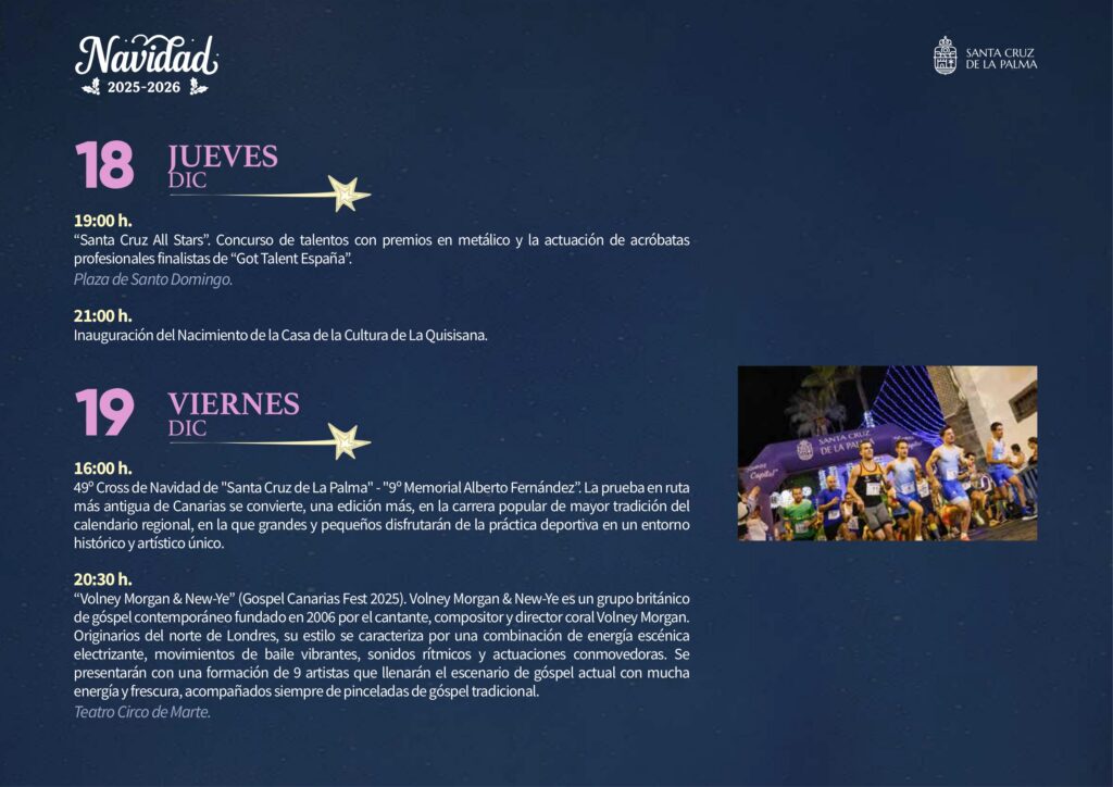 16:00 h. 49° Cross de Navidad de «Santa Cruz de La Palma» – «9° Memorial Alberto Fernández». La prueba en ruta más antigua de Canarias se convierte, una edición más, en la carrera popular de mayor tradición del calendario regional, en la que grandes y pequeños disfrutarán de la práctica deportiva en un entorno histórico y artístico único.
