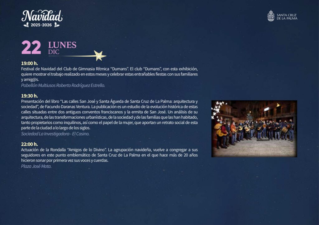 22:00 h. Actuación de la Rondalla «Amigos de lo Divino». La agrupación navideña, vuelve a congregar a sus seguidores en este punto emblemático de Santa Cruz de La Palma en el que hace más de 20 años hicieron sonar por primera vez sus voces y cuerdas.