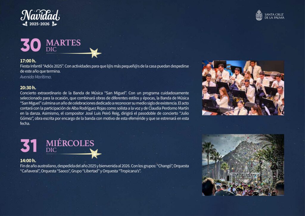 18:00 h. Pasacalles instrumental de la Escuela Insular de Música de La Palma. El alumnado de las distintas especialidades del centro recorrerá las principales vías de Santa Cruz de La Palma interpretando villancicos.