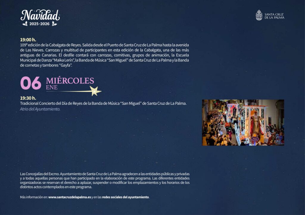 19:00 h. 109ª edición de la Cabalgata de Reyes. Salida desde el Puerto de Santa Cruz de La Palma hasta la avenida de Las Nieves. Carrozas y multitud de participantes en esta edición de la Cabalgata, una de las más antiguas de Canarias. El desfile contará con carrozas, comitivas, grupos de animación, la Escuela Municipal de Danza «Maika Lerín», la Banda de Música «San Miguel» de Santa Cruz de La Palma y la Banda de cornetas y tambores «Gayfa».